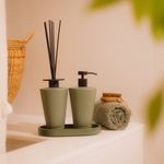 Transforme o lavabo em um espaço de bem-estar e acolhimento com o Combo Lavabo Essências da Terra Chá Verde, composto por Difusor de Varetas, Sabonete Líquido e Bandeja Decorativa.